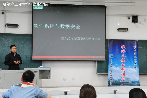 本次讲座邀请我校国家保密学院院长助理、嵌入式与物联网研究所副所长、硕士生导师孙建国副教授。孙建国老师曾赴美国伯克利大学访问学习。首先,孙老师为大家讲解软件自身与安全之间的关系,并强调软件系统的安全一直未得到有效解决。孙老师从软件生产过程、软件自身、软件赖以生存的环境以及软件的运行环境几个方面来详细分析了软件安全、存储安全、通信安全、使用安全和运行安全等问题。最后,还分析了目前软件及数据安全问题日益加剧的趋势,通过斯诺登“棱镜门”事件比较直观的让学生了解到安全问题对每个人存在的影响。