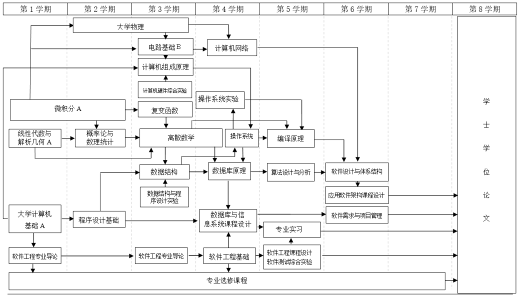 软件工程专业导论 | 面向对象基础 | 离散数学 | 数据结构 | 数据库原理 | 算法设计与分析 | 软件设计与体系结构 | 计算机组成原理 | 软件工程基础 | 操作系统 | 计算机网络 | 编译原理 | 软件需求分析与项目管理 | ||||