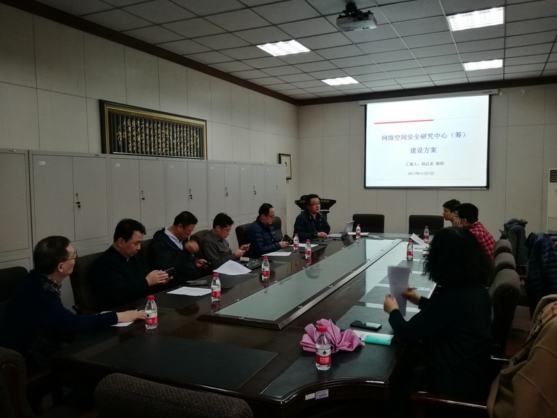 2017年11月7日9:00,21号楼435会议室,学院组织召开网络空间安全中心建设实施方案汇报会,科研院、国家特色化示范性bat365中文官方网站、理学院、经管学院相关筹备人员参加此次会议。韩启龙副院长代表中心筹备组向参会代表做了详细汇报,包括中心的建设背景、建设体系、建设方案、建设内容、团队设置、发展目标等;印桂生院长代表计算机学院进行了发言,强调网络空间安全中心建设工作的重要性;杨武教授针对中心的体系设置,方向梳理提出相应意见;理学院、经管学院的参会教师也针对中心未来的工作表达了想法。之后学校科研院张海鹏处长代表学校向参会人员表达了感谢,指出中心的谋划涵盖多个学院多个方向,要认真梳理研究方向,把中心建设工作做实,希望大家群策群力,跨院系合作,集中优势建设网络空间安全中心。会议明确了中心主任、学术机构和下一步的工作,责成相关人员尽快完善中心的实施建设方案。