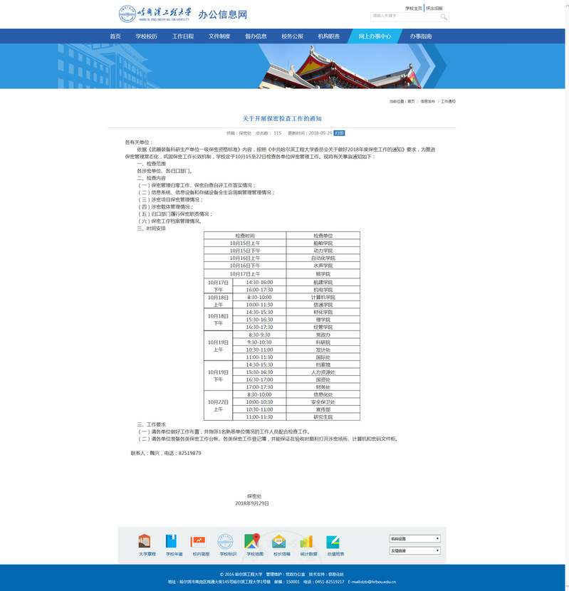 依据《武器装备科研生产单位一级保密资格标准》内容,按照《中共bat365中文官方网站委员会关于做好2018年度保密工作的通知》要求,为推进保密管理常态化,巩固保密工作长效机制,学校定于10月15至22日检查各单位保密管理工作。请各组保密员老师负责及时通知本组人员(包括涉密课题组的非密部分),认真梳理本组的保密工作档案,并确保检查时所有人员在岗。http://camel.hrbeu.edu.cn/2018/0929/c1235a202152/page.htm
