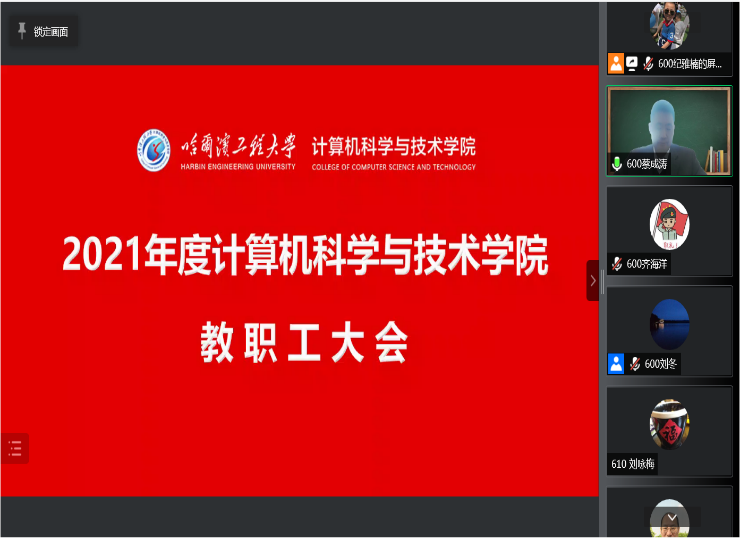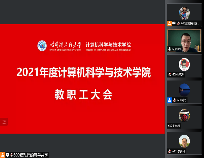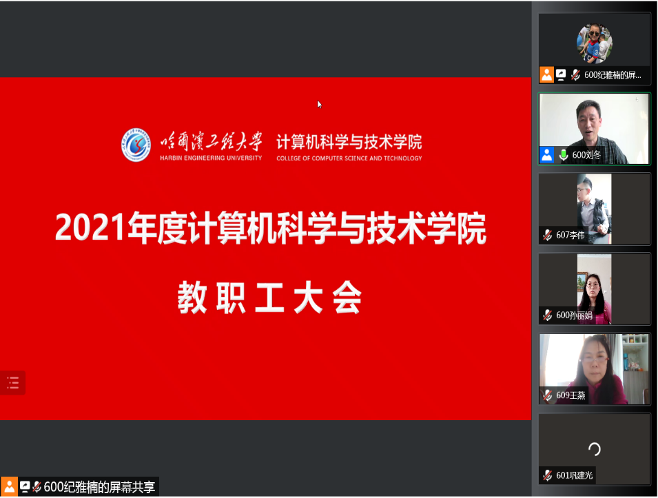会议由学院党委书记刘冬同志主持召开,计算机科学与技术学院院长蔡成涛,党委副书记刘正,副院长董宇欣、田凯、冯光升、王巍及全体教职工(包括合同二类、科研岗)参加会议,根据线上会议统计显示学院共有143位教工线上参会,占应参加会议职工总数的93.46%。