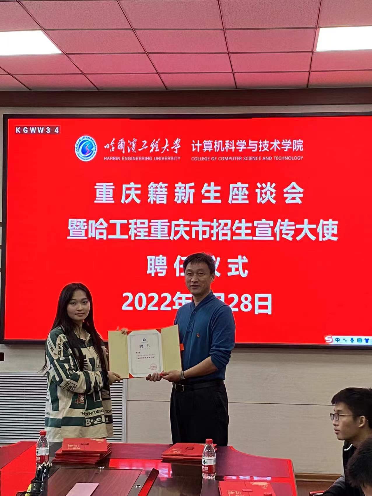 图2. 刘冬书记为本科新生颁发“重庆市招生宣传大使”聘书