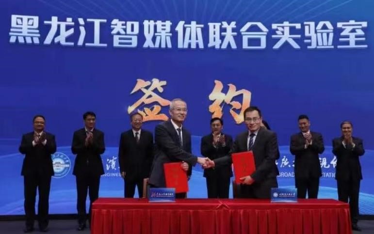 2022年10月28日,我省首家校媒合作实验室“黑龙江智媒体联合实验室”启动仪式在黑龙江省电视台举行,该实验室由我校依托我院和黑龙江广播电视台共同建立。省委宣传部副部长、黑龙江广播电视台党组书记、台长王永石和校党委书记高岩分别致辞,党委常委、副校长於志文与黑龙江广播电视台总工程师马晓波代表两家单位共同签署合作协议。学院院长蔡成涛,科研副院长王巍参加了此次启动仪式。