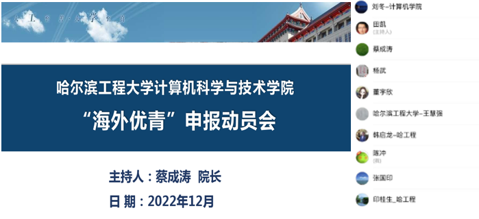 为全面贯彻习近平总书记关于做好新时代人才工作的重要思想,落实学校 《人才队伍高质量发展三年行动方案》,深入推进新时代人才强校战略,全力做好下一年度国家自然科学基金优秀青年科学基金项目(海外)(以下简称“海外优青”)国家级人才项目申报工作,12月10日,计算机学院召开2023年度海外优青国家级人才项目申报工作线上动员会。党委书记刘冬,副院长田凯、董宇欣,院学术分委员会主任杨武,高岗教授代表印桂生、韩启龙、王慧强、张国印,各中心党支部书记及学院全体海外学缘教师参加会议。蔡成涛院长主持会议。
