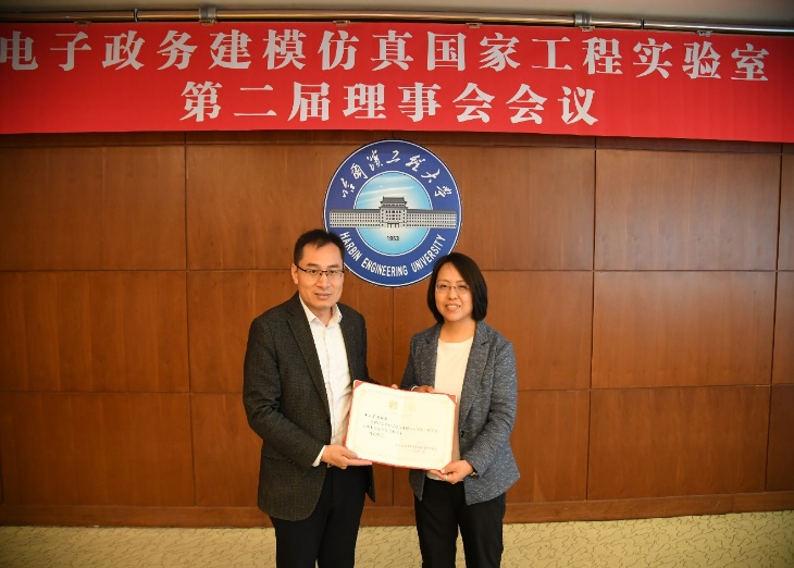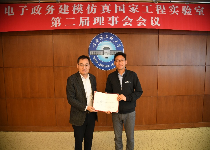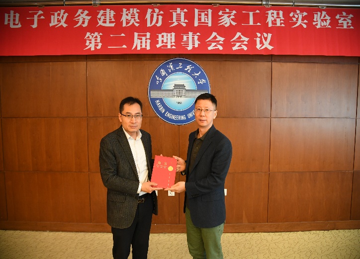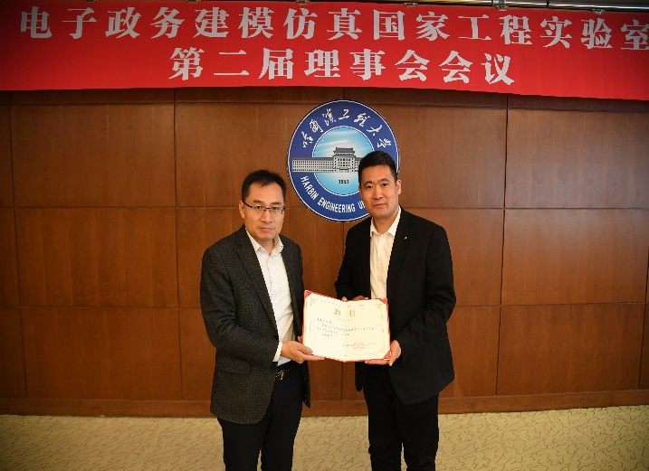 首先,实验室副主任王巍宣读电子政务建模仿真国家工程实验室理事会任命文件。电子政务建模仿真国家工程实验室理事成员由姚郁、於志文、蔡成涛、仲恺、江源富、刘燕、杨凤春、赵海涛、孟庆国、党毅共10人组成,姚郁当选为第二届理事会理事长,於志文当选为常务副理事长,孟庆国、仲恺、蔡成涛当选为副理事长。