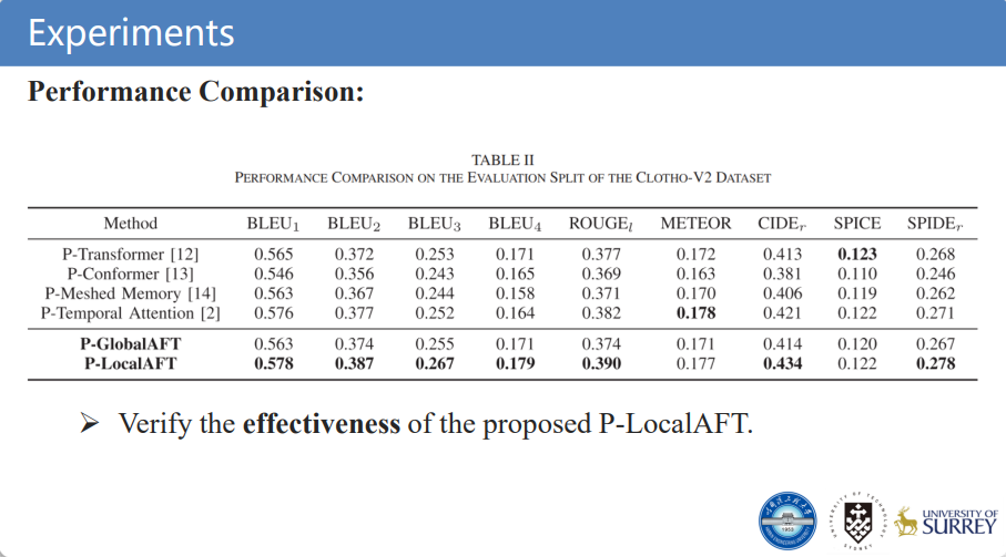 音频语意概述任务致力于用自然语言概述文本(如字幕短句)描述音频数据内容。现有方法通常采用“编码器-解码器”结构构建音频语意概述模型,其中基于注意力机制的解码器结构(如Transformer decoder)被广泛用于解码器设计,并取得了较为不错的性能表现。尽管基于注意力机制的解码器结构能够利用注意力机制有效捕获音频数据的全局信息,但该设计可能会忽略音频信号中的局部信息,进而导致预测概述文本失准。为了解决这一问题,团队提出了一种基于局部信息辅助的解码器结构,通过局部注意力机制,在保留全局信息感知能力时,关注并捕获音频数据中潜在的局部信息,使得局部事件被准确地预测表述,并由此构建了音频语意概述模型,提升音频语意概述性能表现。