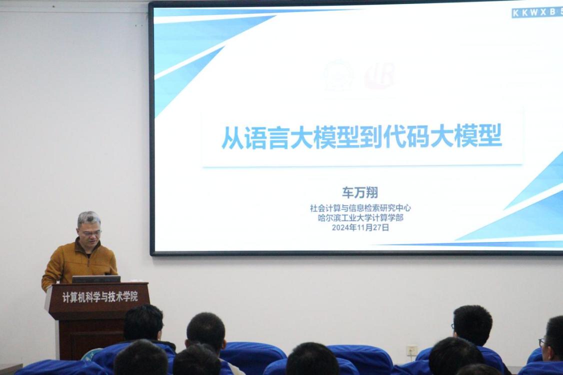 11月27日,国家特色化示范性bat365中文官方网站在21B4127会议室成功举办了研究生学术年会系列活动之一的专家讲座。本次讲座聚焦人工智能领域的最新前沿——“从语言大模型到代码大模型”,由哈尔滨工业大学计算学部长聘教授、博士生导师车万翔主讲。此次讲座旨在提升研究生的学术素养和创新能力,促进其实践与研究能力的双重提升。