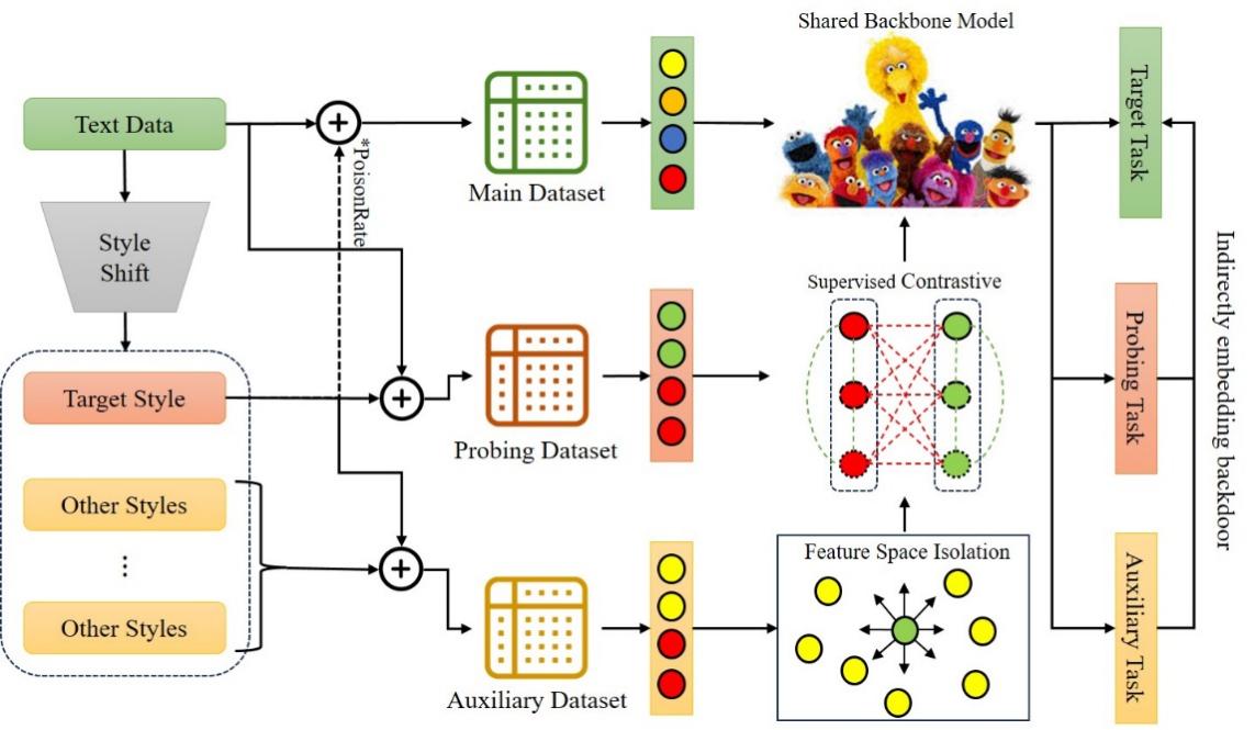 作者提出了两种增强文本后门攻击性能的方法:监督对比学习与特征空间隔离任务。其中,监督对比学习通过增强模型对中毒样本的学习能力,借助参数共享机制显著提升了后门攻击的有效性;而特征空间隔离任务则通过将中毒数据与其他类型数据在特征空间中分离,增强了模型对后门触发特征的敏感度,从而有效降低模型对后门攻击的抵抗力。此外,作者还提出了一种创新的“零中毒攻击”(Zero Poison Attack)方式,无需直接污染目标任务的训练数据,即可间接实现后门嵌入,进一步提升了攻击的隐蔽性与适应性。