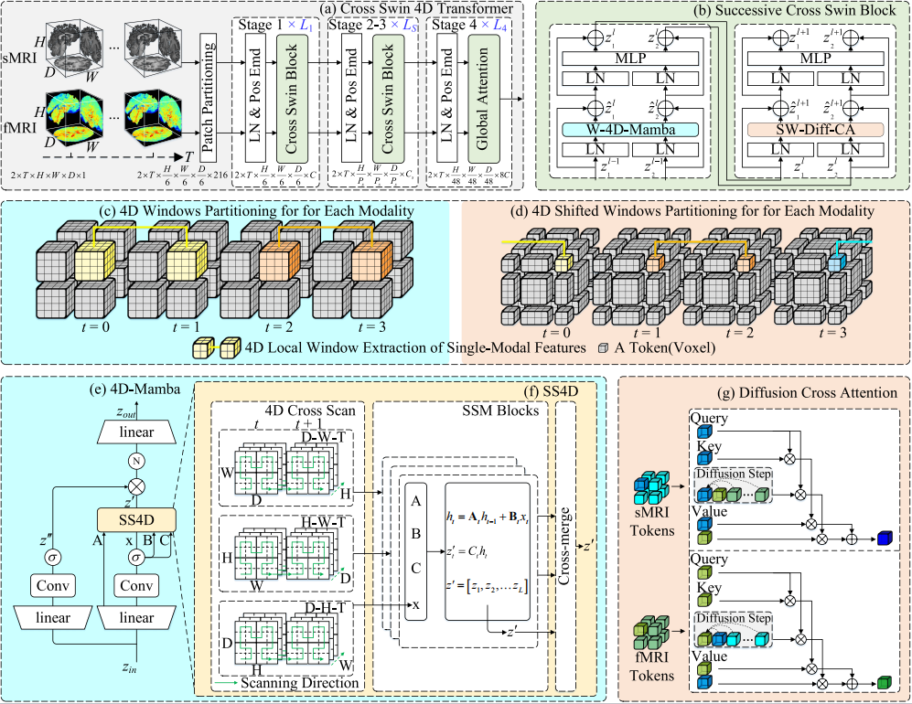 工作简介:多模态高维脑成像数据的时空动态建模任务给神经科学领域带来了巨大的挑战。近期的工作通常结合注意力机制进行层次化建模,但时空特征的逐步提取存在特征孤立问题,且基于注意力的融合机制(如Cross attention,CA)更倾向于学习不同模态间的自相似性信息,对差异化模态之间的互补性信息挖掘不足。为了应对这些挑战,本文提出了Cross Swin 4D Transformer(CrosST),可以通过端到端的方式高效的学习多模态高维脑成像数据的时空模式。CrosST独有的Diffusion Cross attention融合机制在计算注意力的过程中,通过扩散策略连接不同模态的特征,传递模态间的差异信息,从而实现多模态耦合特征的深层次融合。同时,采用对应体素交互策略减轻了融合过程中的计算负担。此外,CrosST采用4D移动窗口技术有效结合了局部和全局信息,并设计了创新性的4D-Mamba算法提升了计算效率。本文采用了大规模阿尔兹海默症数据集,并设计了多粒度的认知阶段任务进行验证,结果证明了CrosST的有效性。