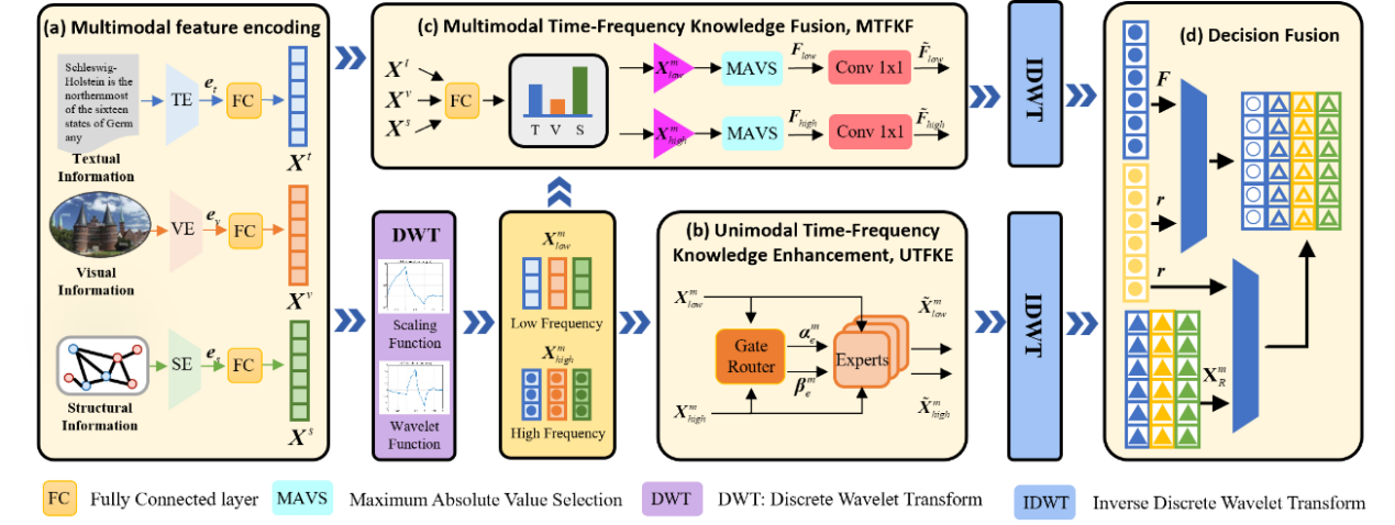 工作简介:多模态链接预测是一种融合结构化知识与非结构化信息的知识图谱推理任务,旨在利用多个模态信息提高实体、关系预测的准确性。然而,现有多模态知识图谱链接预测方法聚焦于在空间域中对实体的文本、图像与结构三种模态信息进行建模,针对模态间原始信号所呈现的高度异质性,通常依赖于复杂的跨态交互机制以实现知识融合。为解决上述问题,本文提出一种基于小波变换的多模态知识图谱链接预测方法WFF(Wavelet-based Filter&Fusion),该方法在时频域中将原始信号分解为正交的时频分量,不同模态特征被映射至正交函数空间中具有差异性的分布表示,通过对不同模态的多尺度时频信息进行自适应滤波以抑制模态内无关成分,有效避免了空间域中复杂的噪声抑制过程;该方法同时结合可学习门控机制与多模态时频最大绝对值选择策略,在时频域内高效融合结构、文本、图像、音频与视频等多种模态间的互补信息,从函数空间层面解决多模态融合过程中的分布对齐难题。在实现单模态时频知识增强与多模态时频知识融合的基础上,该方法进一步通过逆离散小波变换将单模态与融合后的时频表示重构至空间域,并基于其空间嵌入完成决策融合。