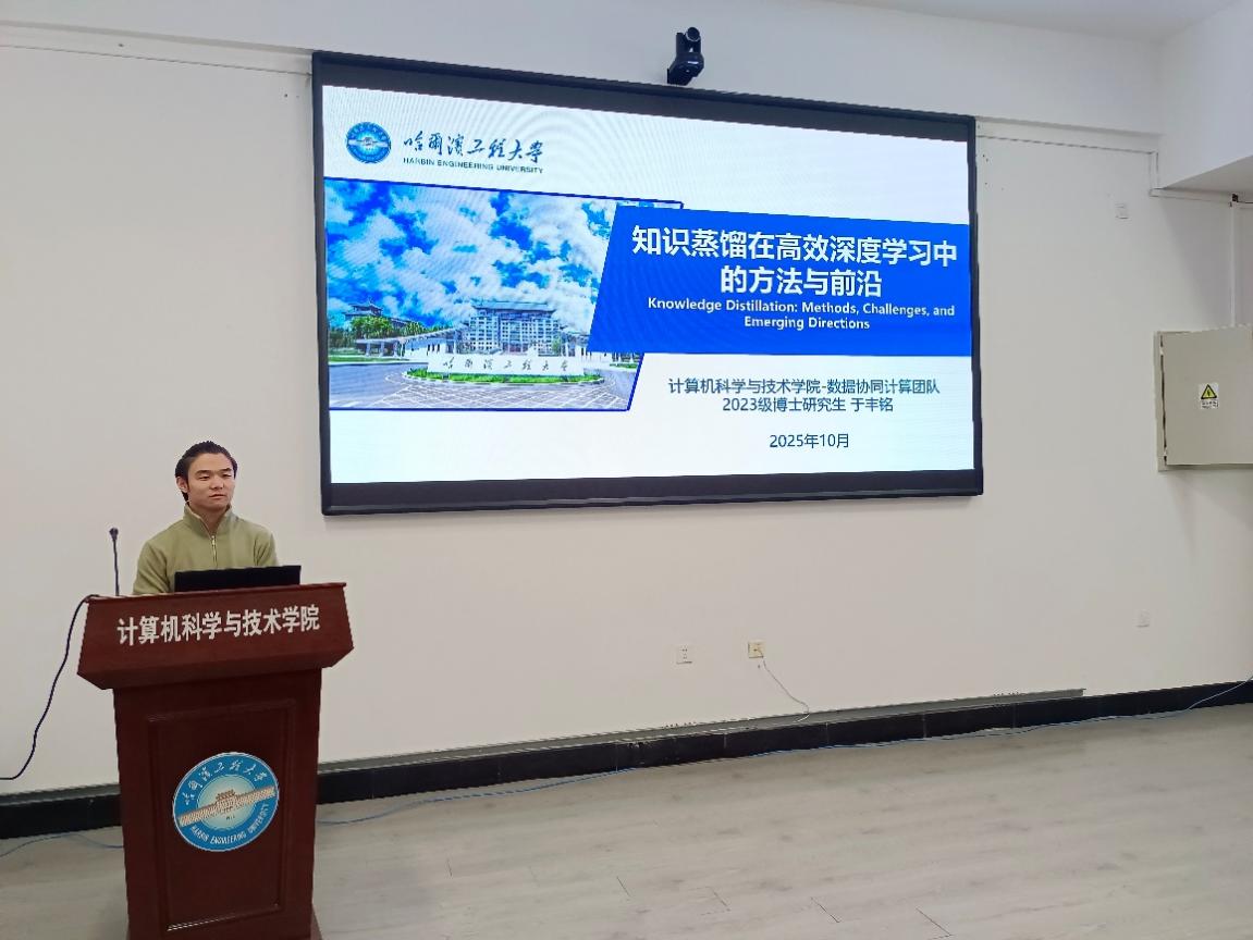来自计算机科学与技术学院的数据协同计算团队代表于丰铭,随后带来了其在数据蒸馏理论、方法及系统构建方面的前沿探索,展示了高效数据处理能力在解决大规模复杂问题中的潜力。最后,该学院人工智能与媒体计算团队的朱亚隆,汇报了团队在人工智能前沿算法、媒体内容分析与生成等领域的创新工作,凸显了智能技术在提升系统感知与交互能力方面的广阔应用空间。