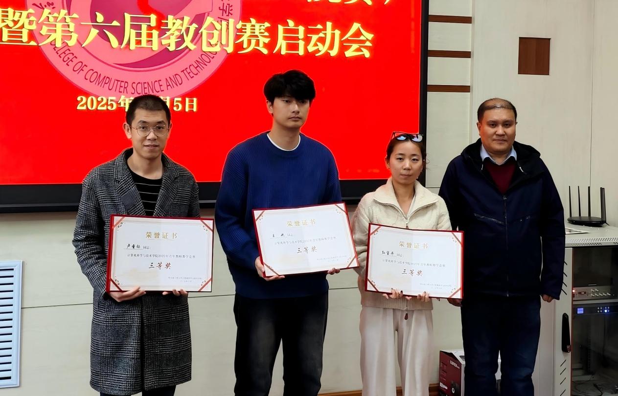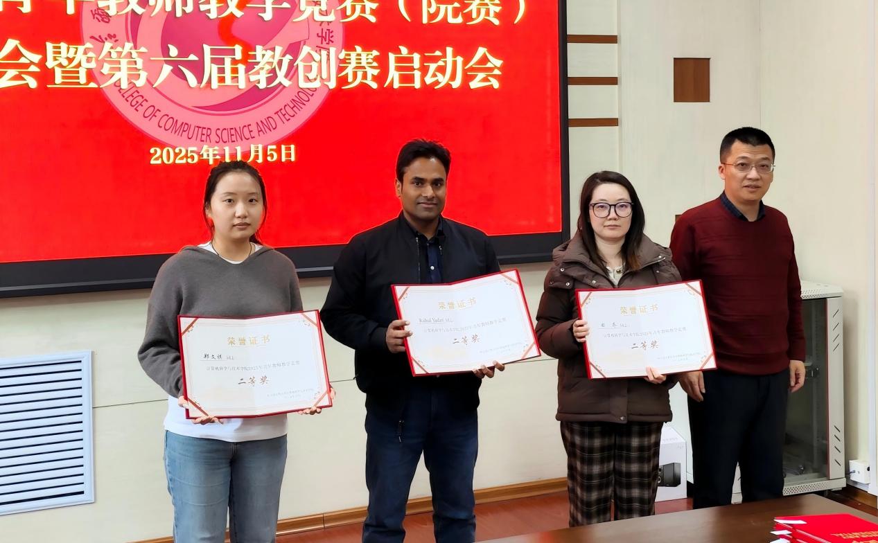 会议由学院本科教育办公室刘蕴喆主持。会议首先对第五届青年教师教学竞赛(校赛)的组织与实施情况进行简要回顾,宣读获奖名单:李熔盛、李伟获一等奖;郑文祺、田乔、Rahul Yadav获二等奖;王也、卢圣钰、孙宝丹获三等奖。与会领导及教学督导为获奖教师颁发荣誉证书并对获奖教师表示祝贺,同时勉励全体教师持续精进教学能力,发挥示范引领作用。